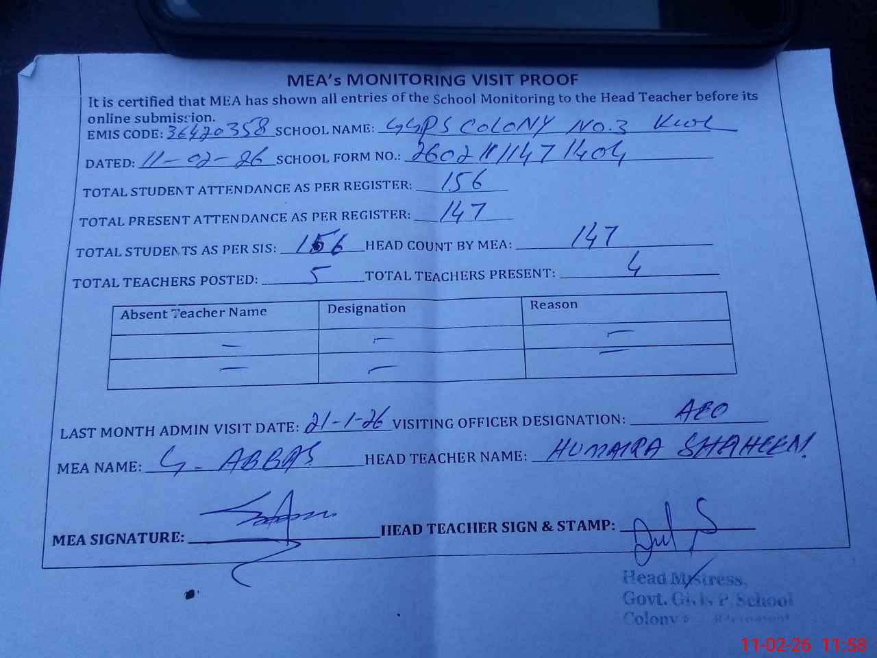 | EMIS Code: 36420358 | Name of School: GGPS COLONY NO.3 KHANEWAL | |||