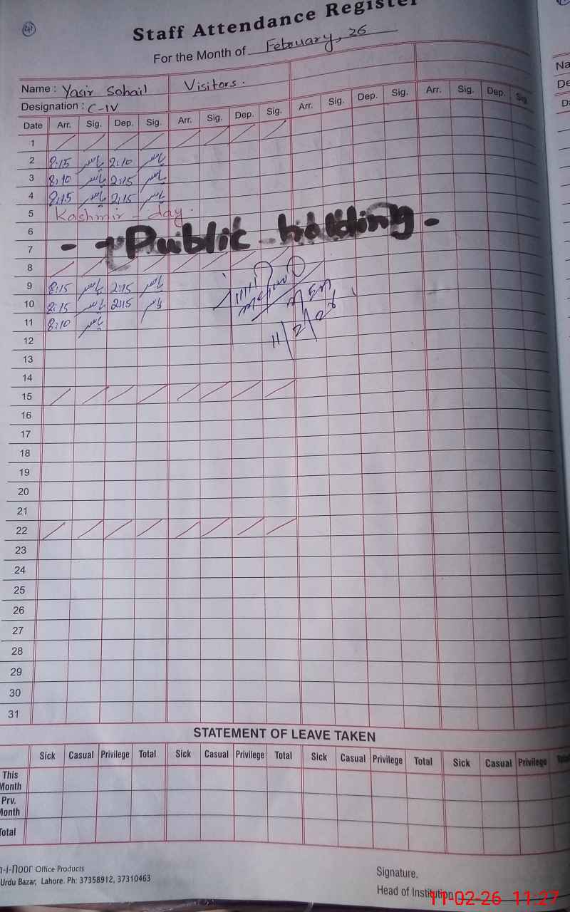 | CNIC | Full Name | Designation | R/C | Absence During Last Calender Month |