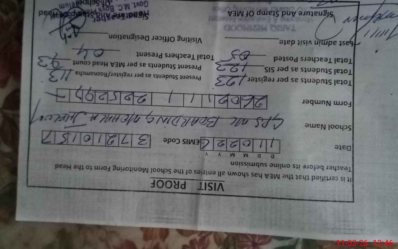 | Attendance Register | Head Teacher | MEA with School | Visit Proof |