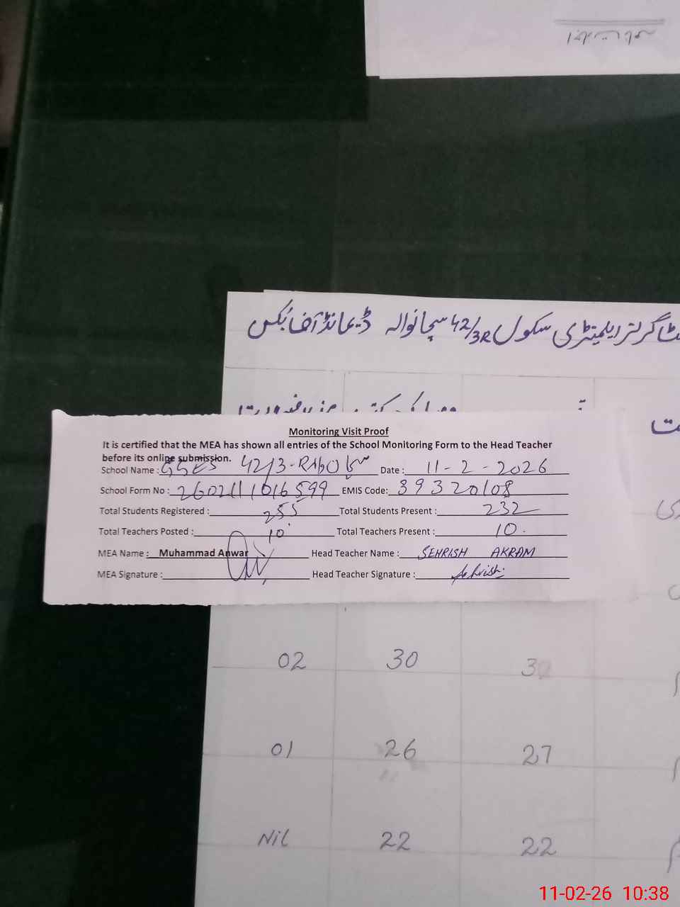 | Attendance Register | Head Teacher | MEA with School | Visit Proof |