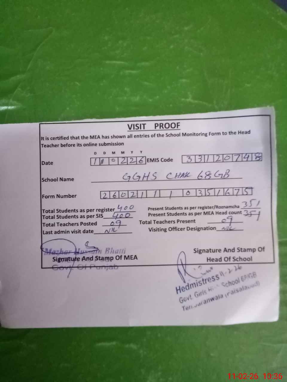 | Attendance Register | Head Teacher | MEA with School | Visit Proof |