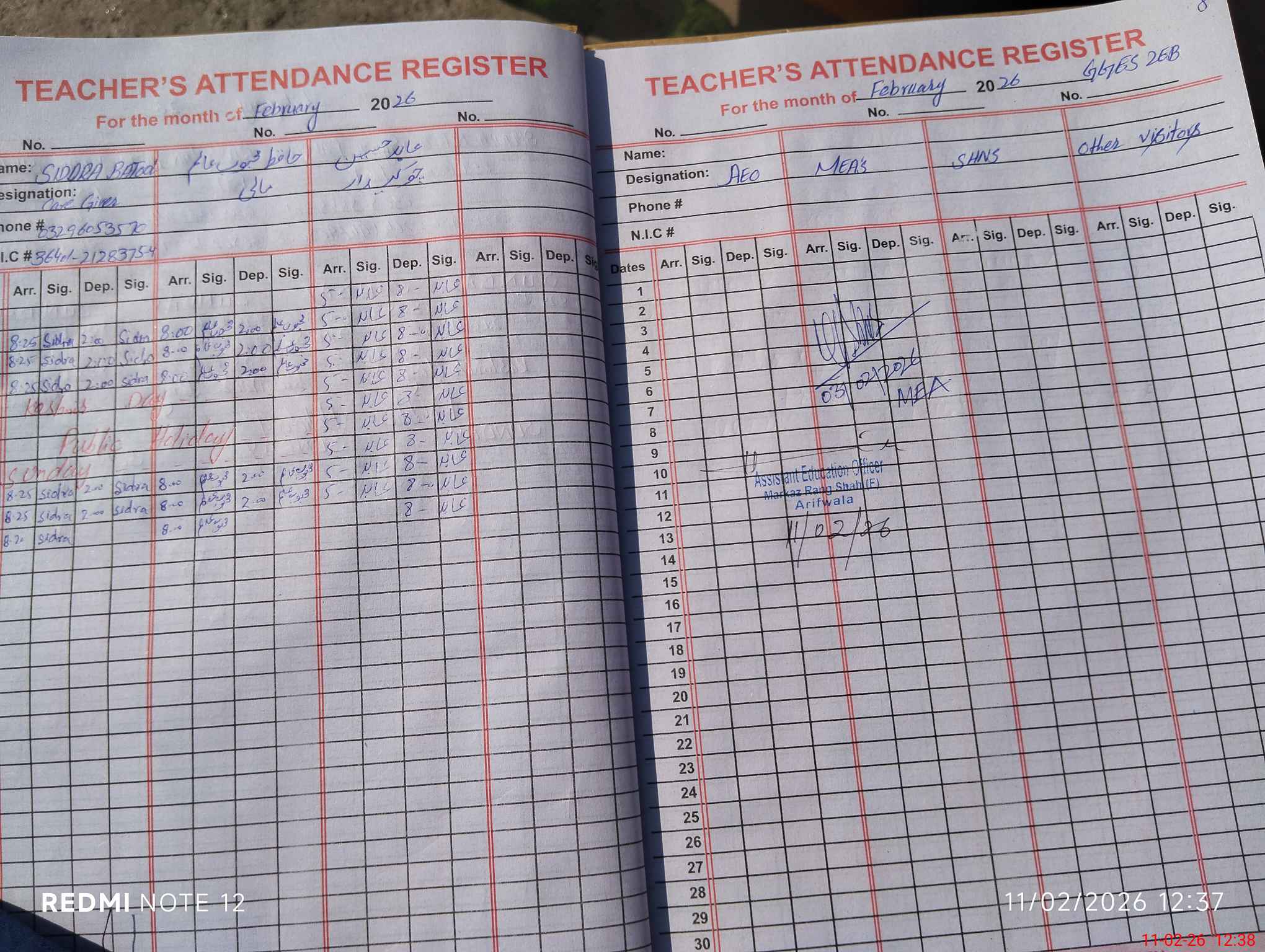 | Name: FE**** ZA**** Designation: (School Headmaster's/Headmistress's) SST(BIO) Phone/Cell Number: 03**** |