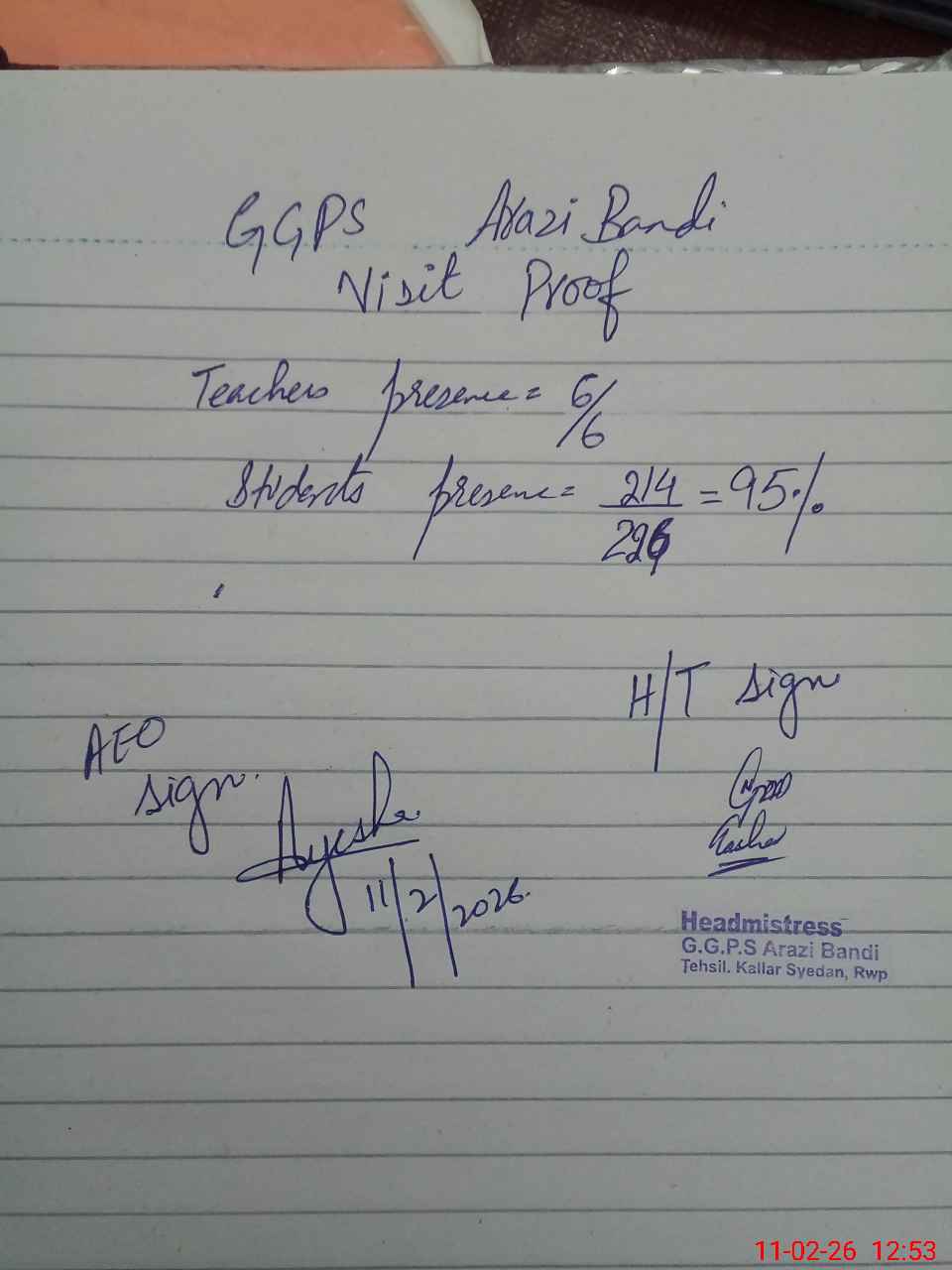 | Attendance Register | Head Teacher | MEA with School | Visit Proof |