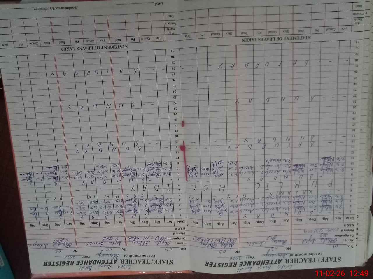 | CNIC | Full Name | Designation | R/C | Absence During Last Calender Month |