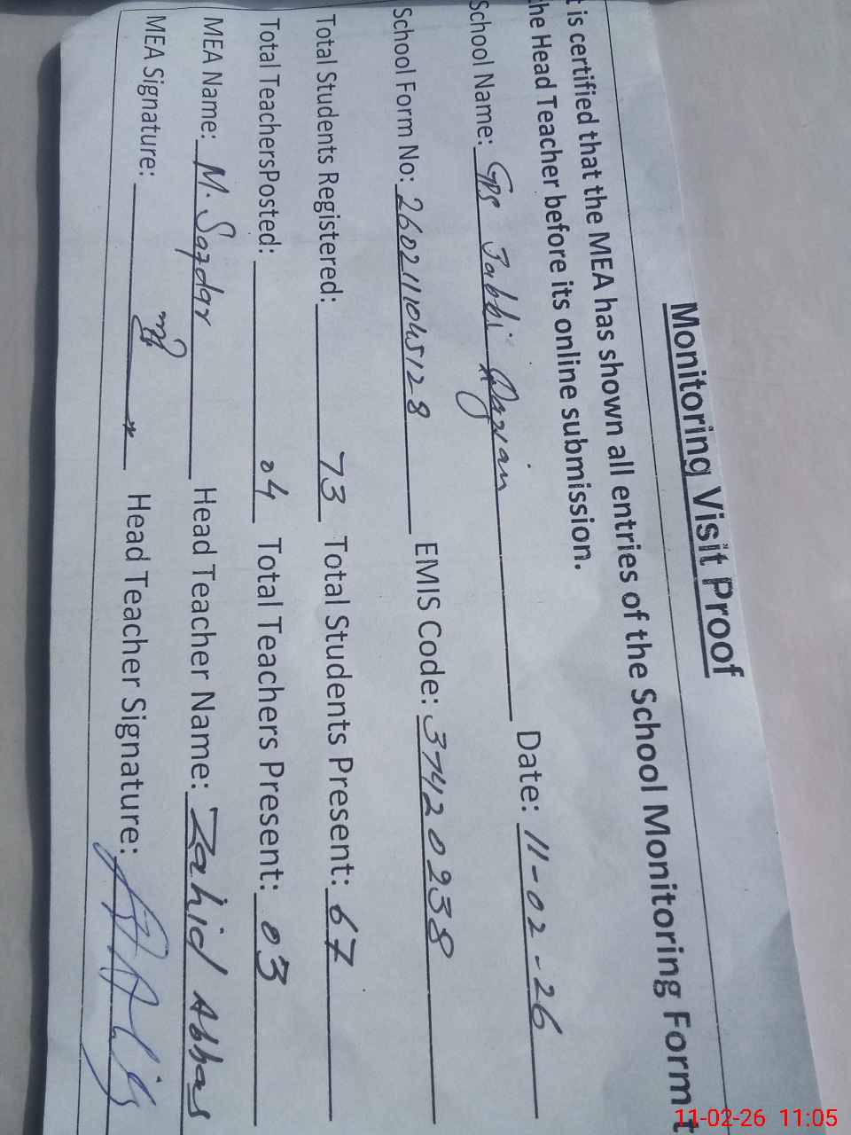 | Monitoring Date: 11-02-2026 | Start Time: 11-02-2026 10:20 AM | End Time: 11-02-2026 11:06 AM | Name of MEA: Mu**** Sa**** | |