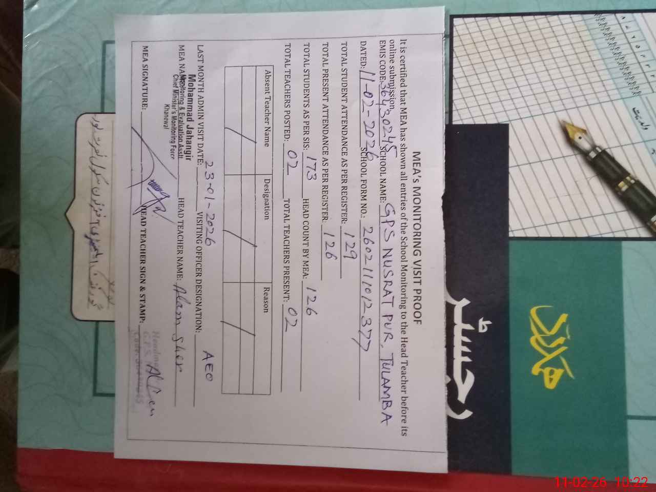 | Attendance Register | Head Teacher | MEA with School | Visit Proof |