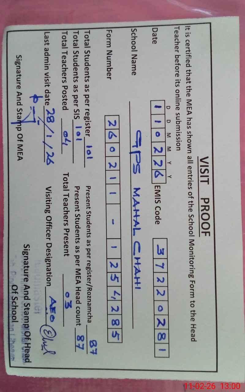 | EMIS Code: 37220281 | Name of School: GPS MAHAL CHAHI | |||