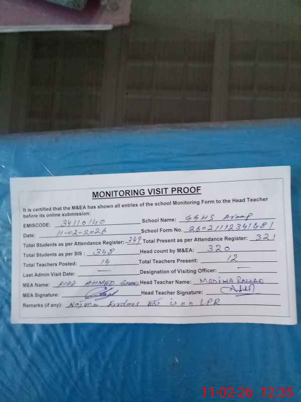 | Remarks (Use Separate Page if Required): Attendance of teaching staff and students on SIS Software is not updated Najma Firdous EST is on LPR w e f 01 April 2025 Data as per provided by School Staff and found during physical visit | |||||