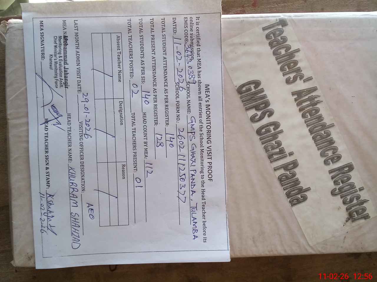 | Attendance Register | Head Teacher | MEA with School | Visit Proof |