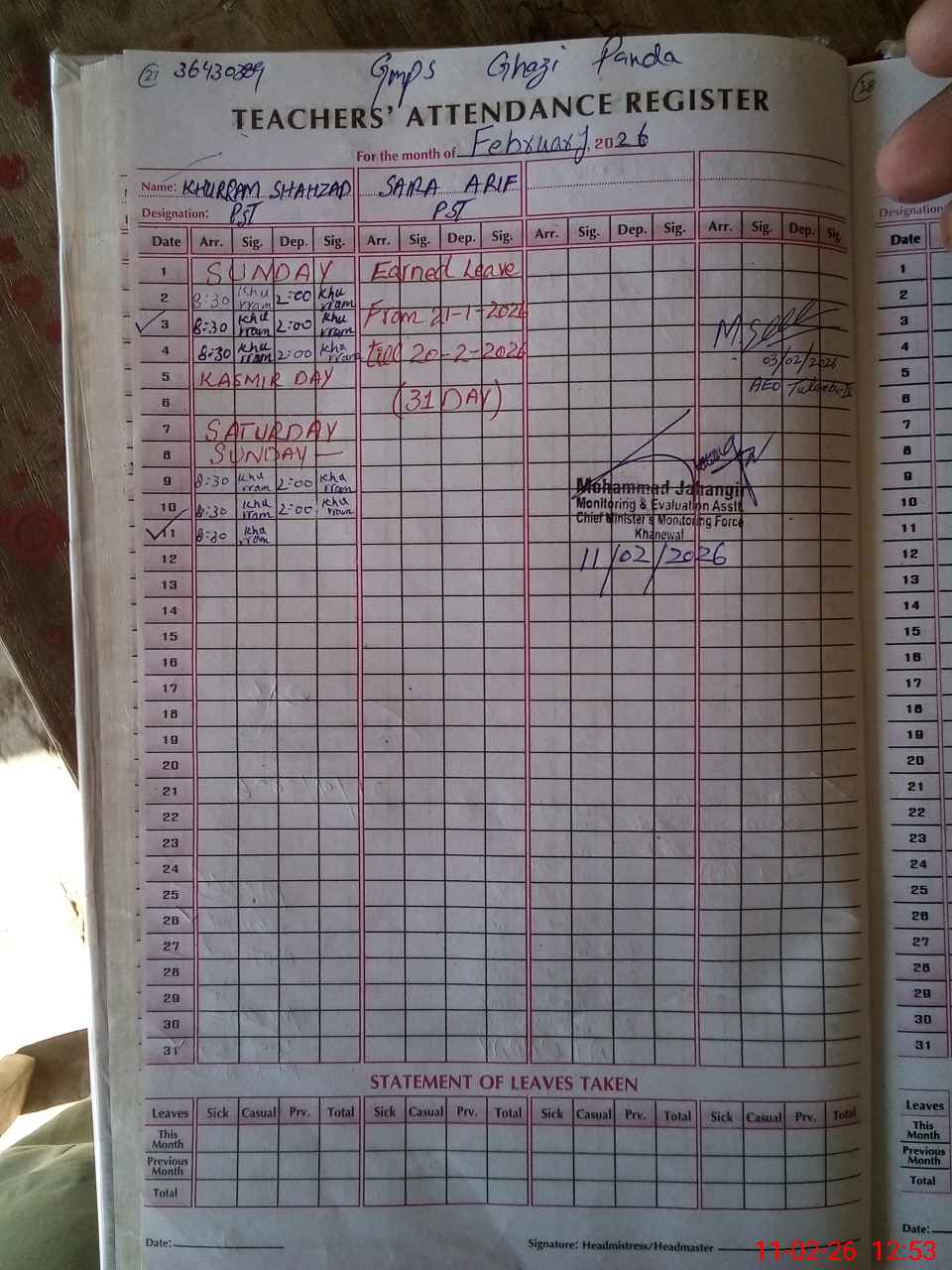 | Monitoring Date: 11-02-2026 | Start Time: 11-02-2026 11:55 AM | End Time: 11-02-2026 12:56 PM | Name of MEA: Mu**** Ja**** | |
