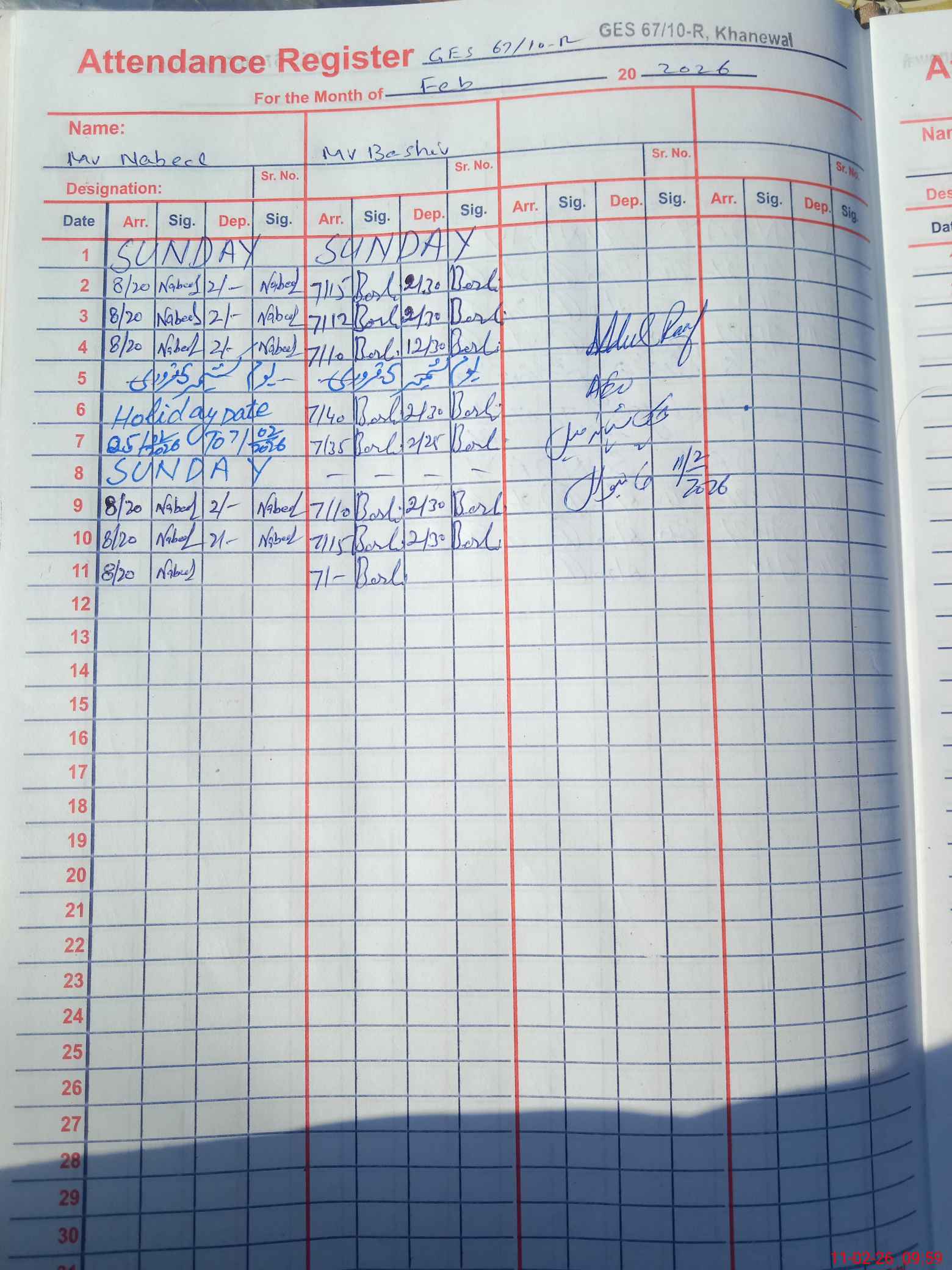 | Monitoring Date: 11-02-2026 | Start Time: 11-02-2026 09:18 AM | End Time: 11-02-2026 10:01 AM | Name of MEA: Ab**** Ra**** | |