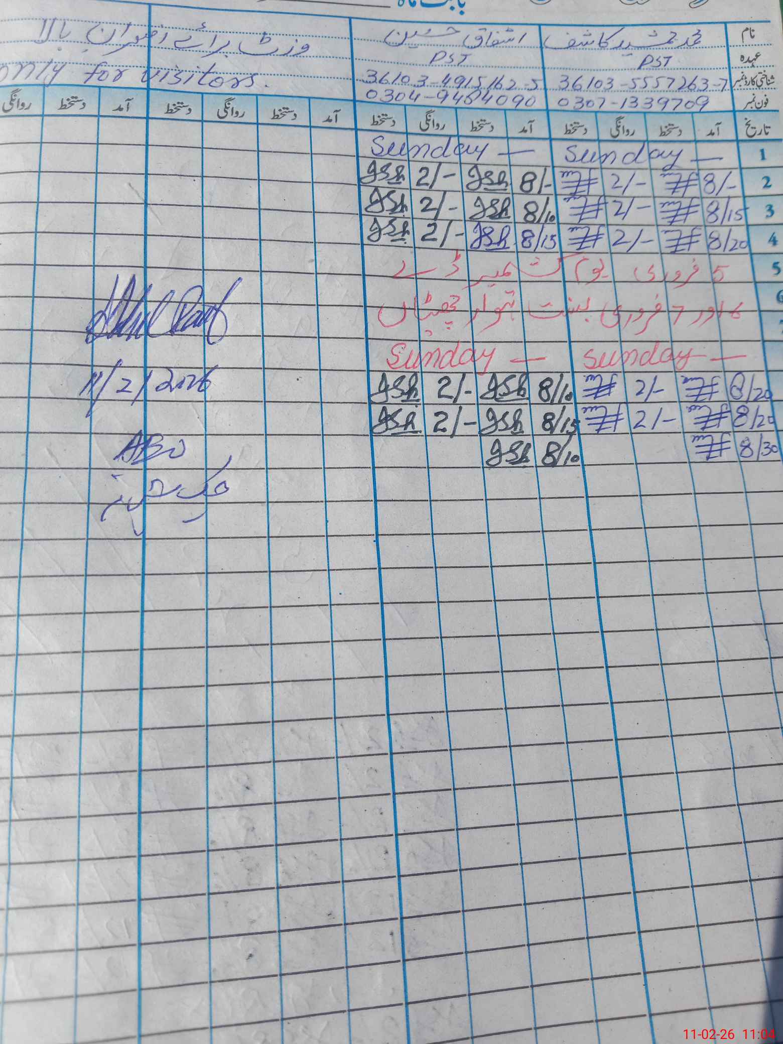 | CNIC | Full Name | Designation | R/C | Absence During Last Calender Month |