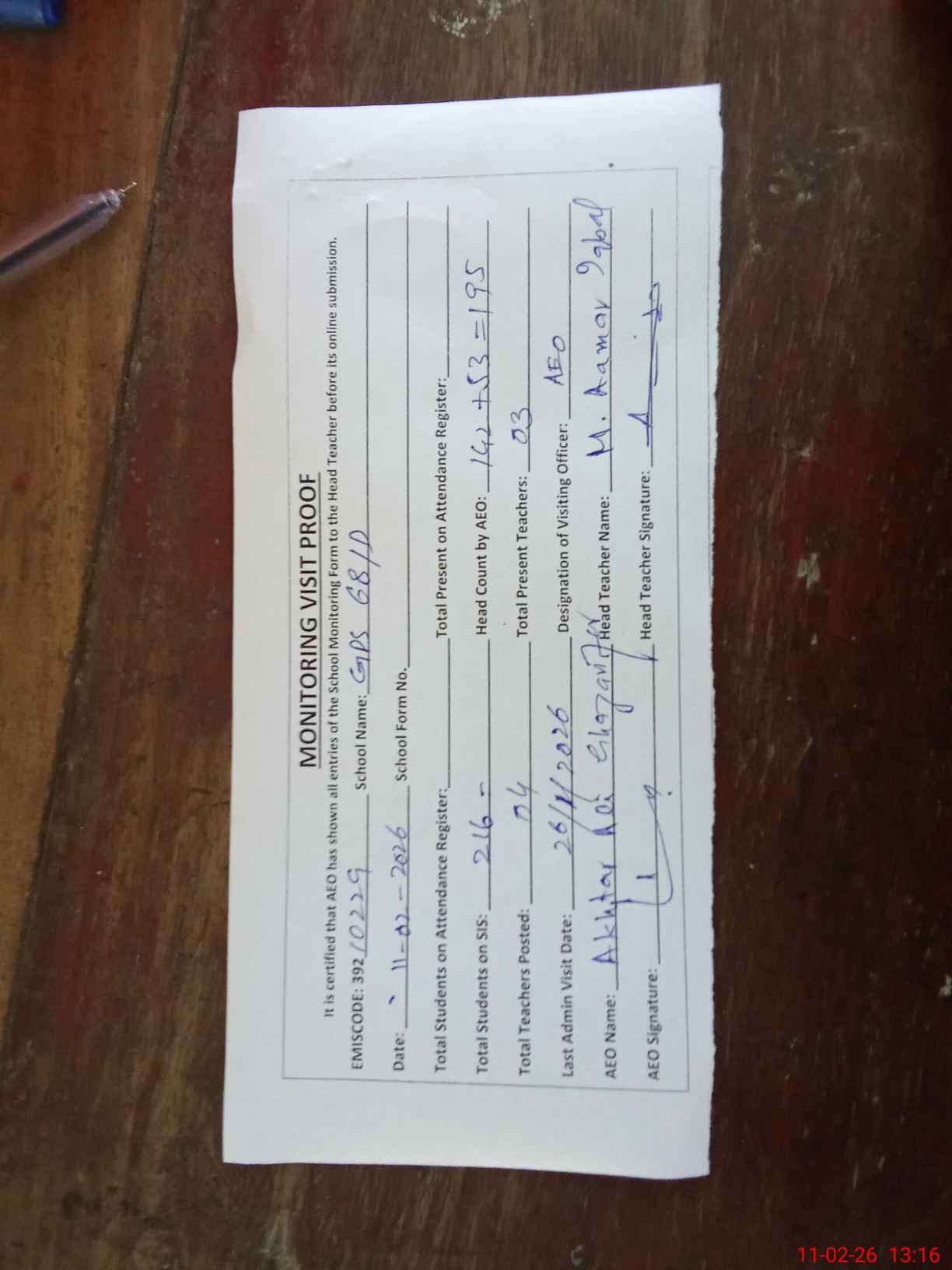 | Monitoring Date: 11-02-2026 | Start Time: 11-02-2026 12:52 PM | End Time: 11-02-2026 01:20 PM | Name of MEA: Ak**** Al**** Gh**** | |