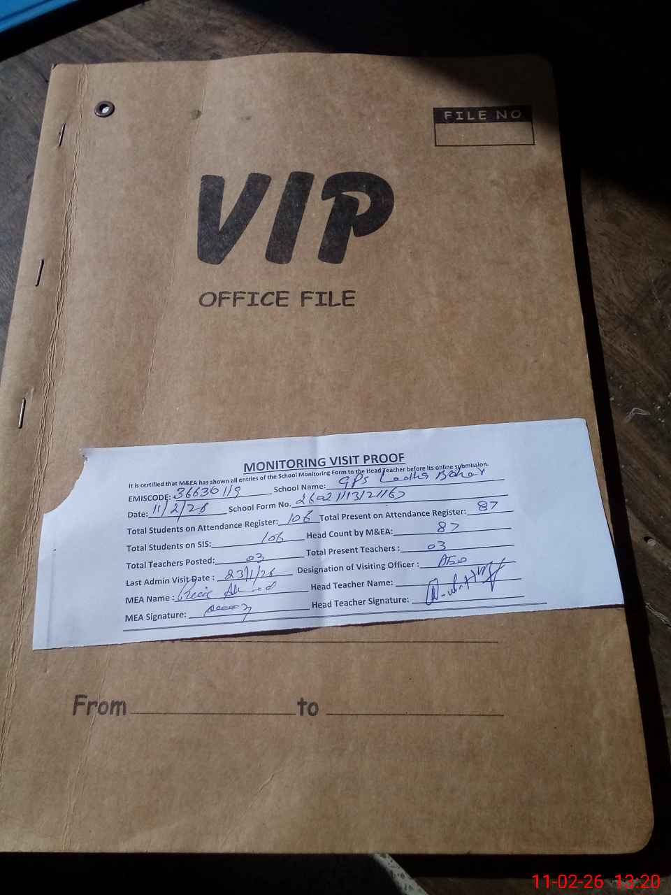 | Attendance Register | Head Teacher | MEA with School | Visit Proof |