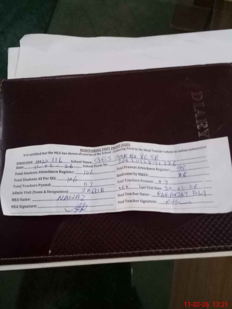 | Attendance Register | Head Teacher | MEA with School | Visit Proof |