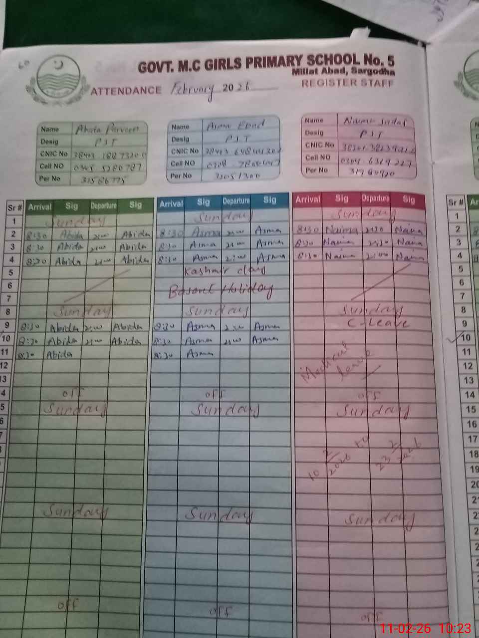 | CNIC | Full Name | Designation | R/C | Absence During Last Calender Month |