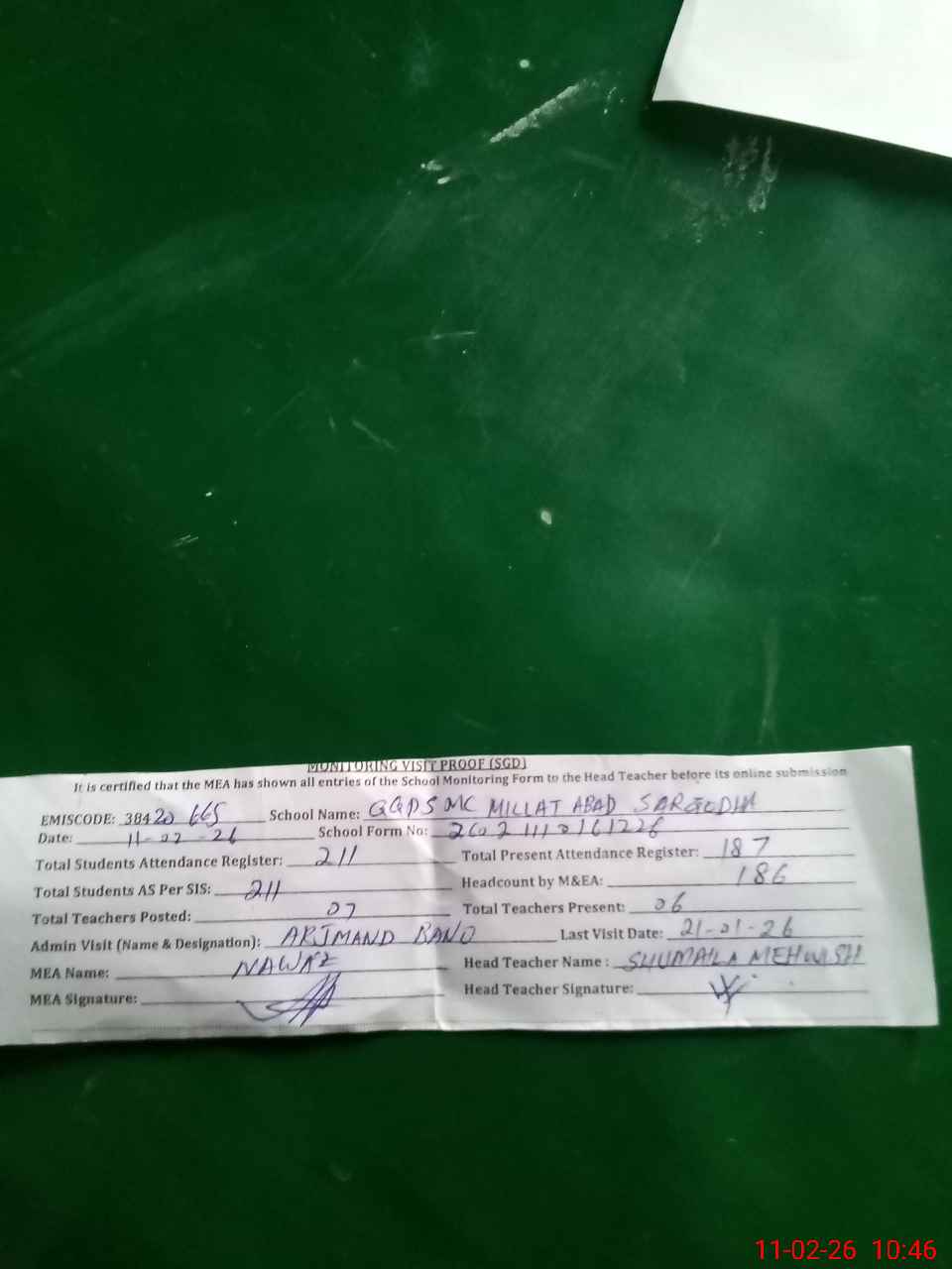 | Attendance Register | Head Teacher | MEA with School | Visit Proof |