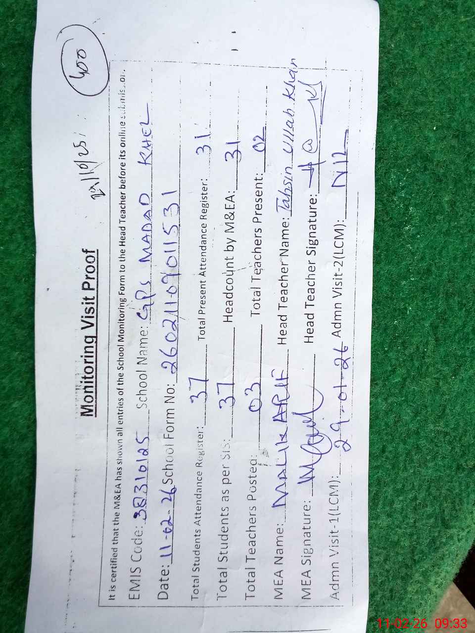 | Attendance Register | Head Teacher | MEA with School | Visit Proof |