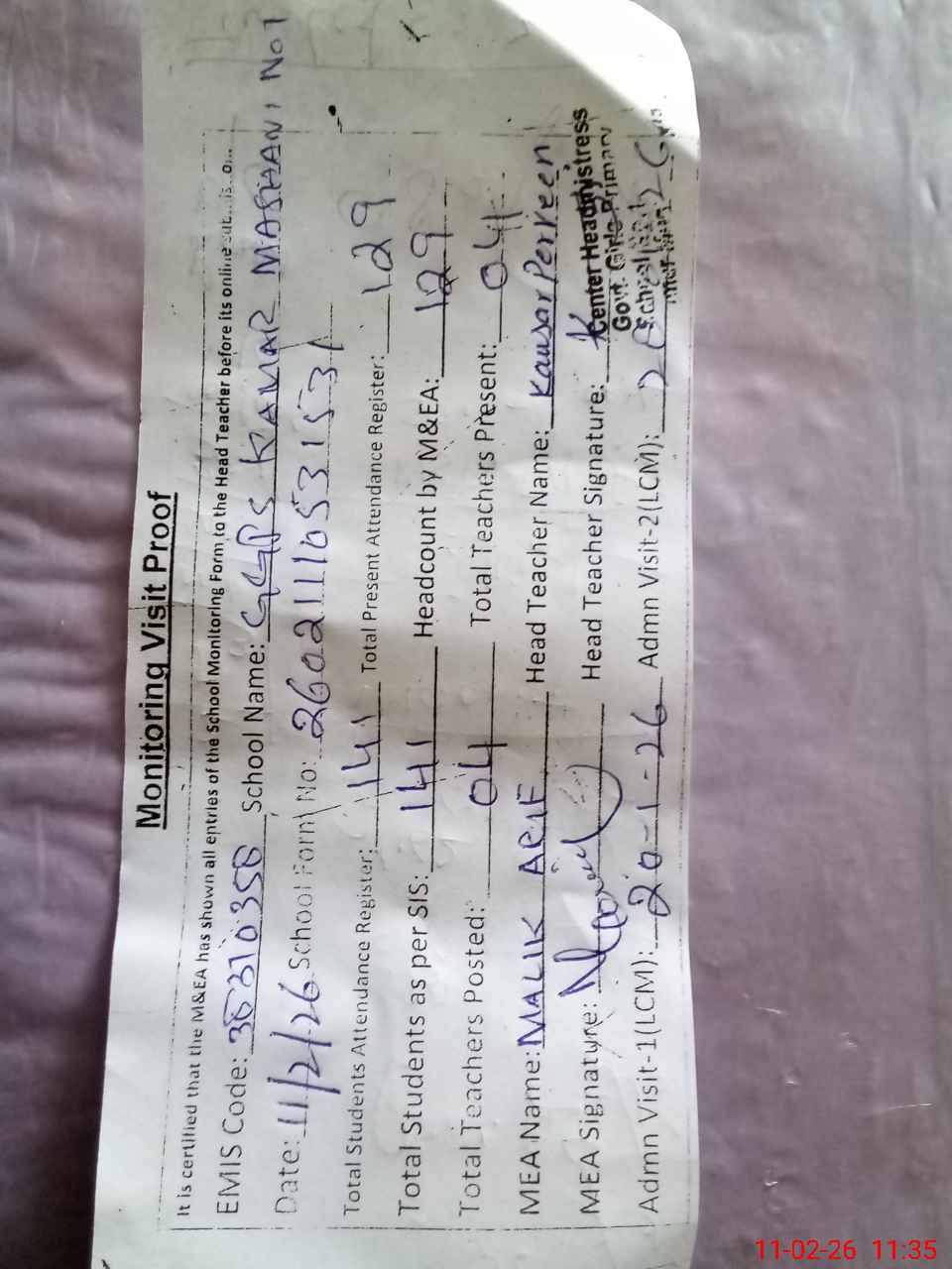 | Attendance Register | Head Teacher | MEA with School | Visit Proof |