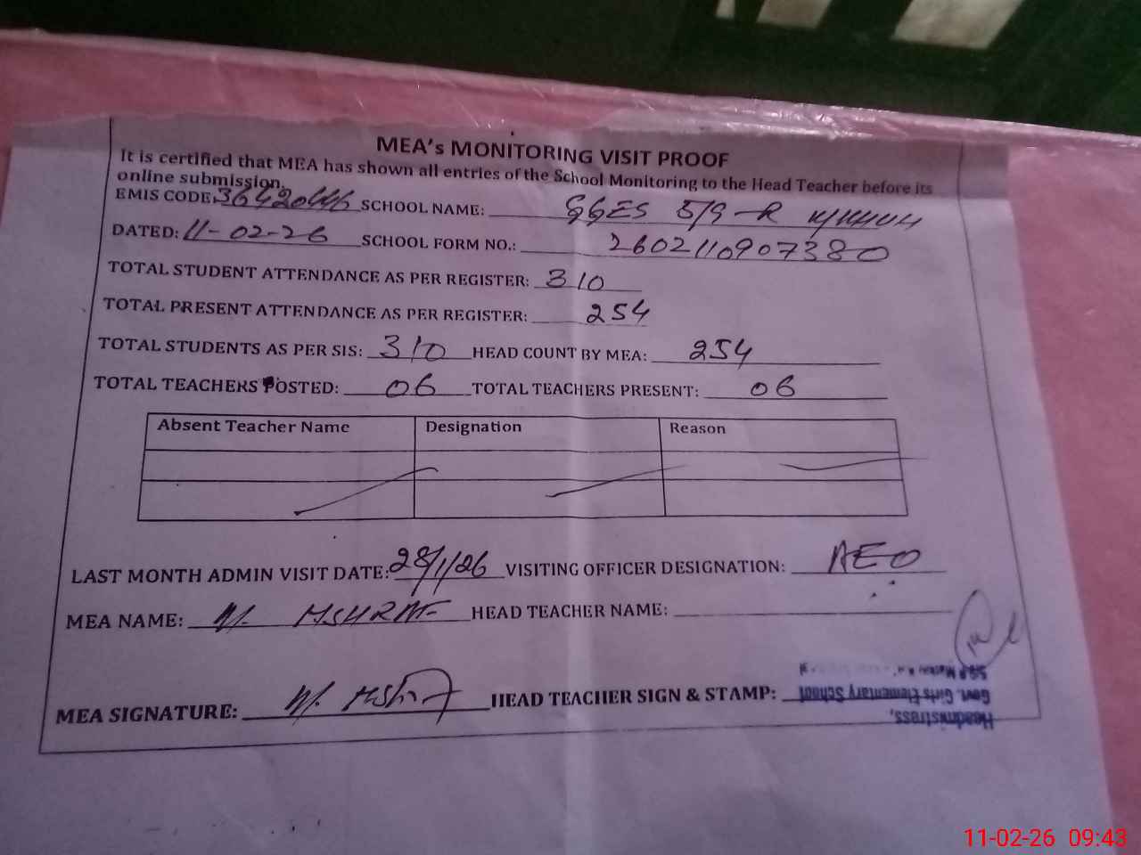 | Attendance Register | Head Teacher | MEA with School | Visit Proof |