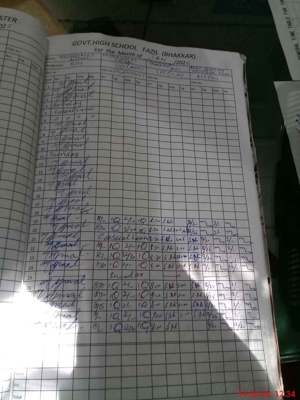 | CNIC | Full Name | Designation | R/C | Absence during last cal. month |