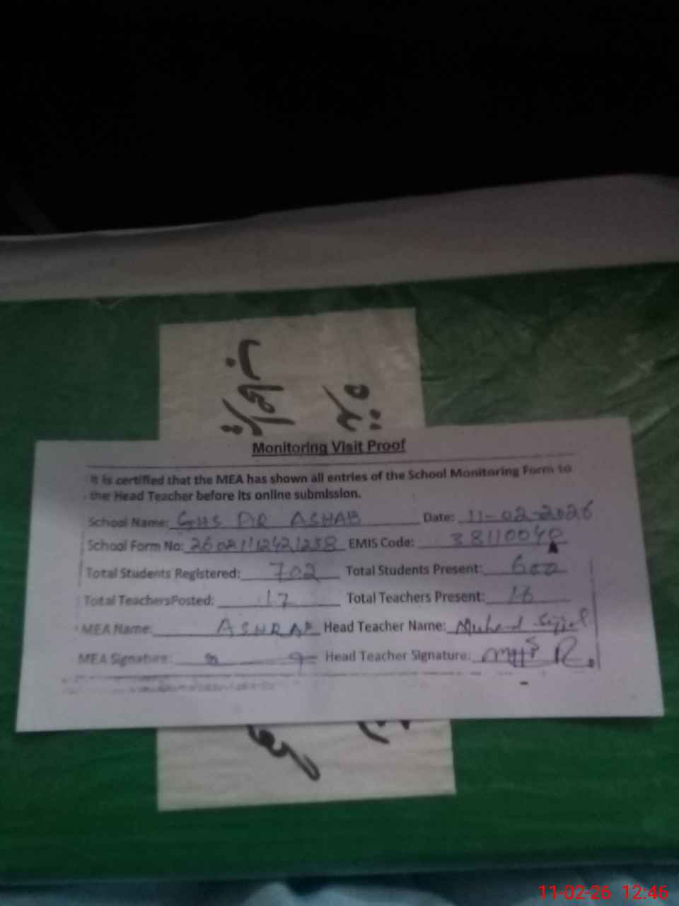 | Certified that this School was Inspected by the Undersigned MEA/DMO Today and the Information Stated Above is as Per Record. | |||||