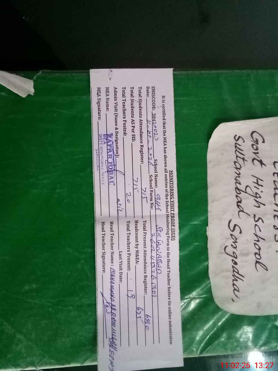 | Attendance Register | Head Teacher | MEA with School | Visit Proof |