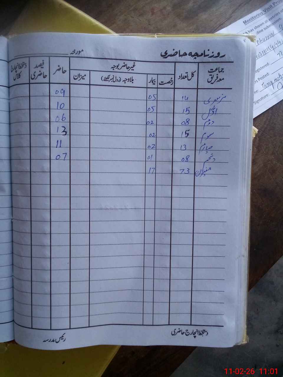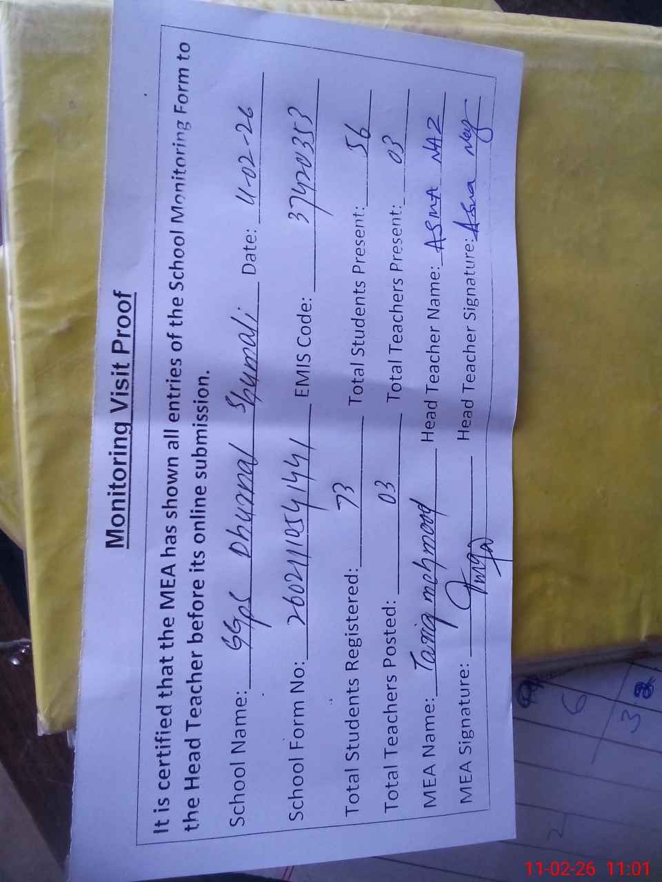 | Attendance Register | Head Teacher | MEA with School | Visit Proof |