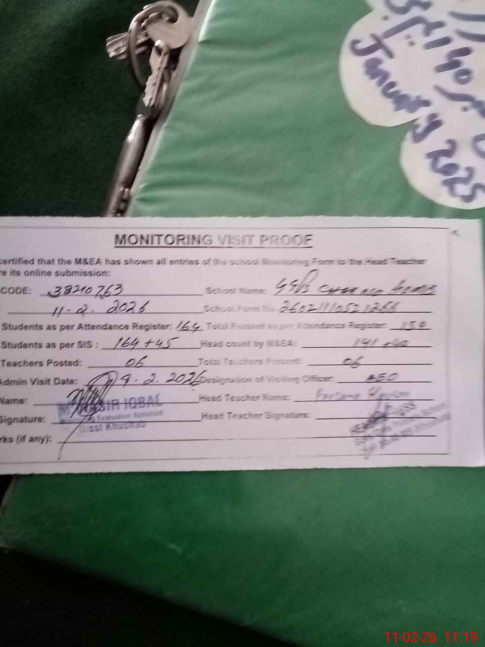 | Attendance Register | Head Teacher | MEA with School | Visit Proof |