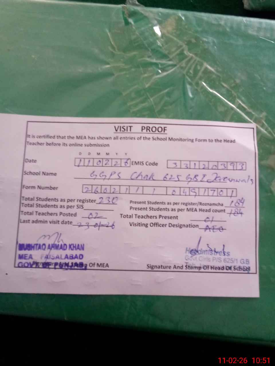 | EMIS Code: 33120393 | Name of School: GGPS CHAK 625 GB I JARANWALA | |||