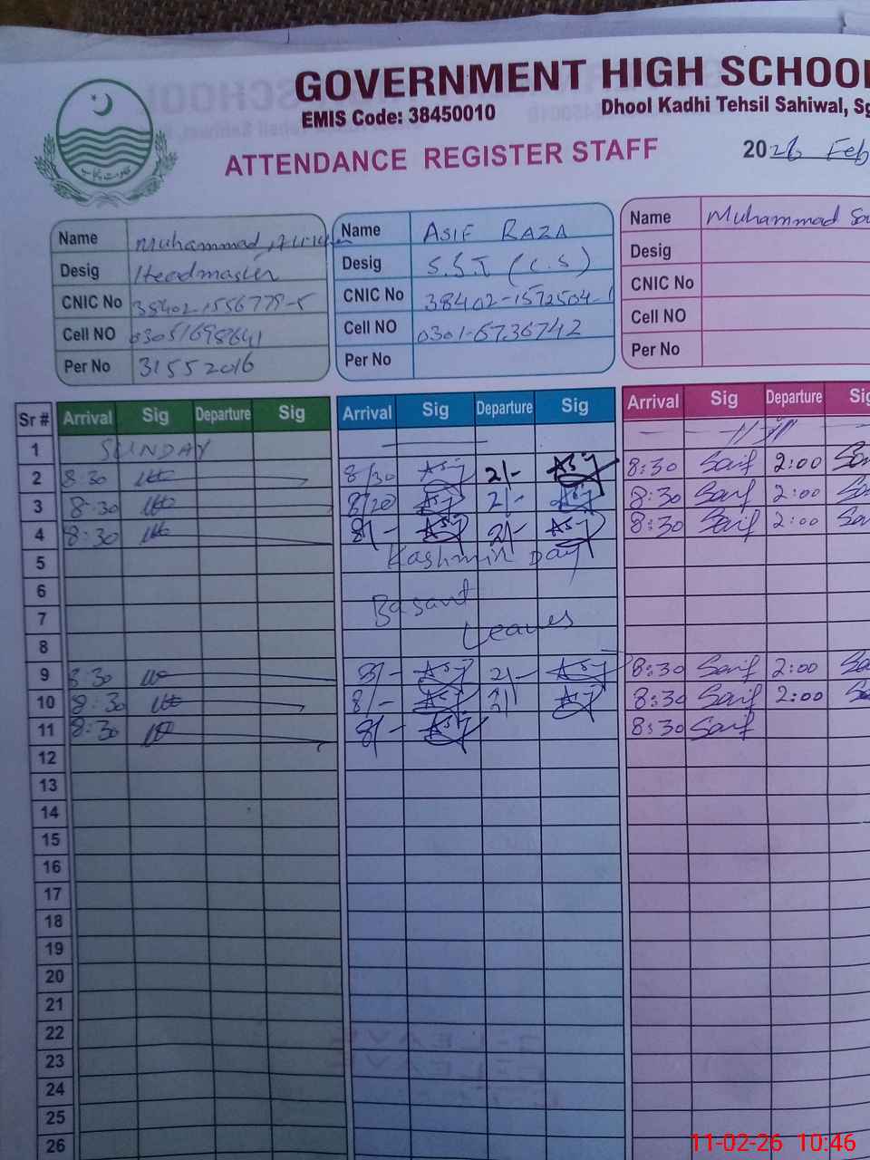 | CNIC | Full Name | Designation | R/C | Absence during last cal. month |