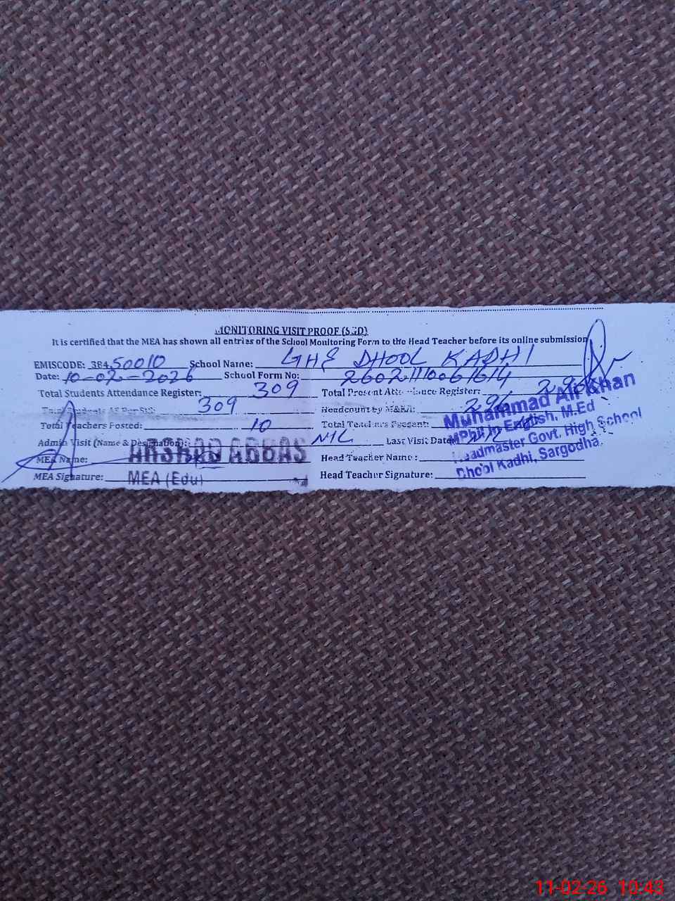 | Name: MU**** AL**** KH**** Designation: (School Headmaster's/Headmistress's) HEADMASTER Phone/Cell Number: 03**** |
