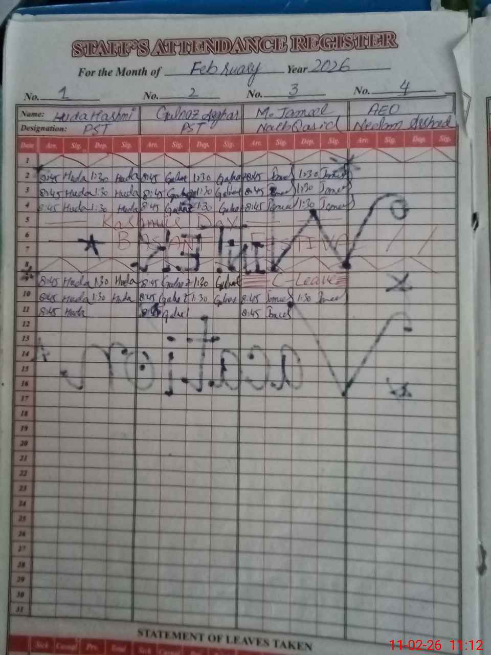 | CNIC | Full Name | Designation | R/C | Absence During Last Calender Month |