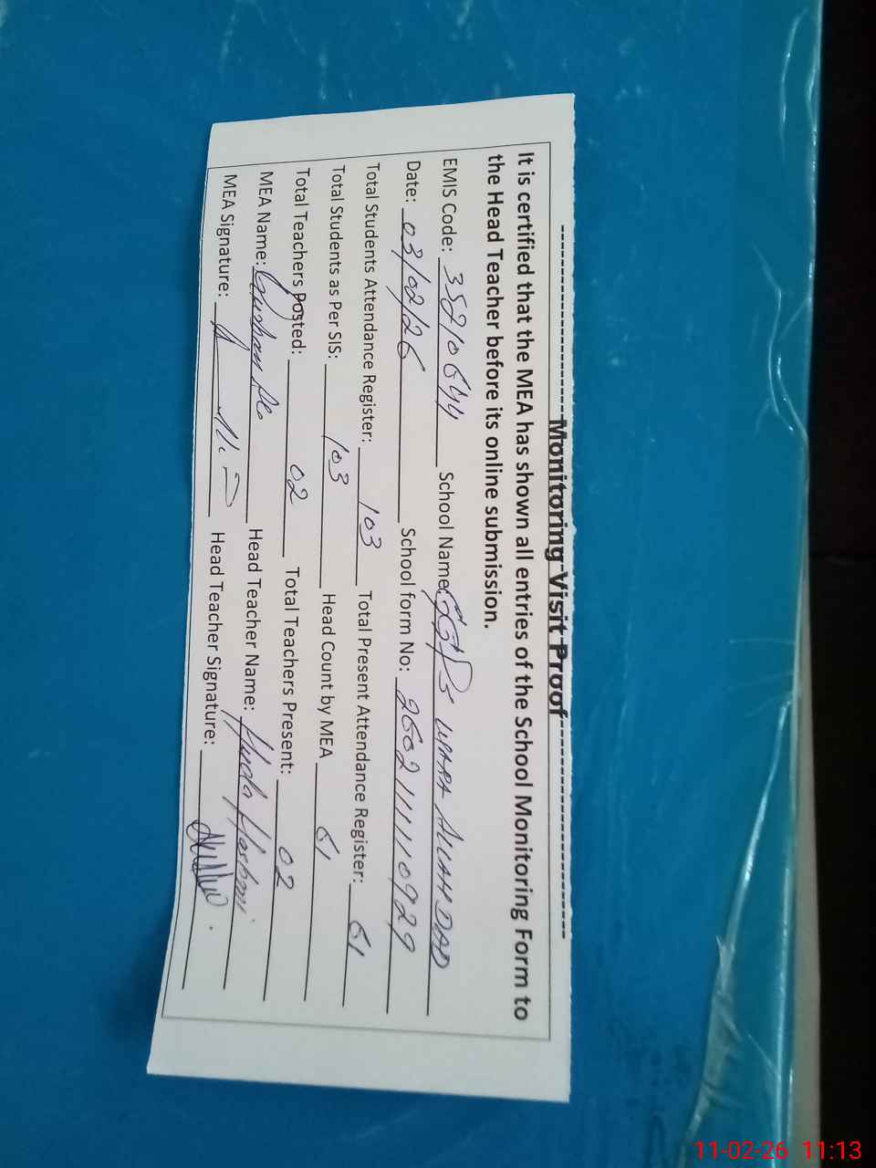 | Attendance Register | Head Teacher | MEA with School | Visit Proof |