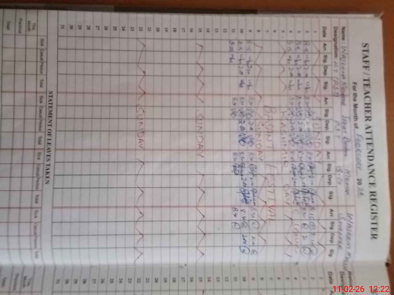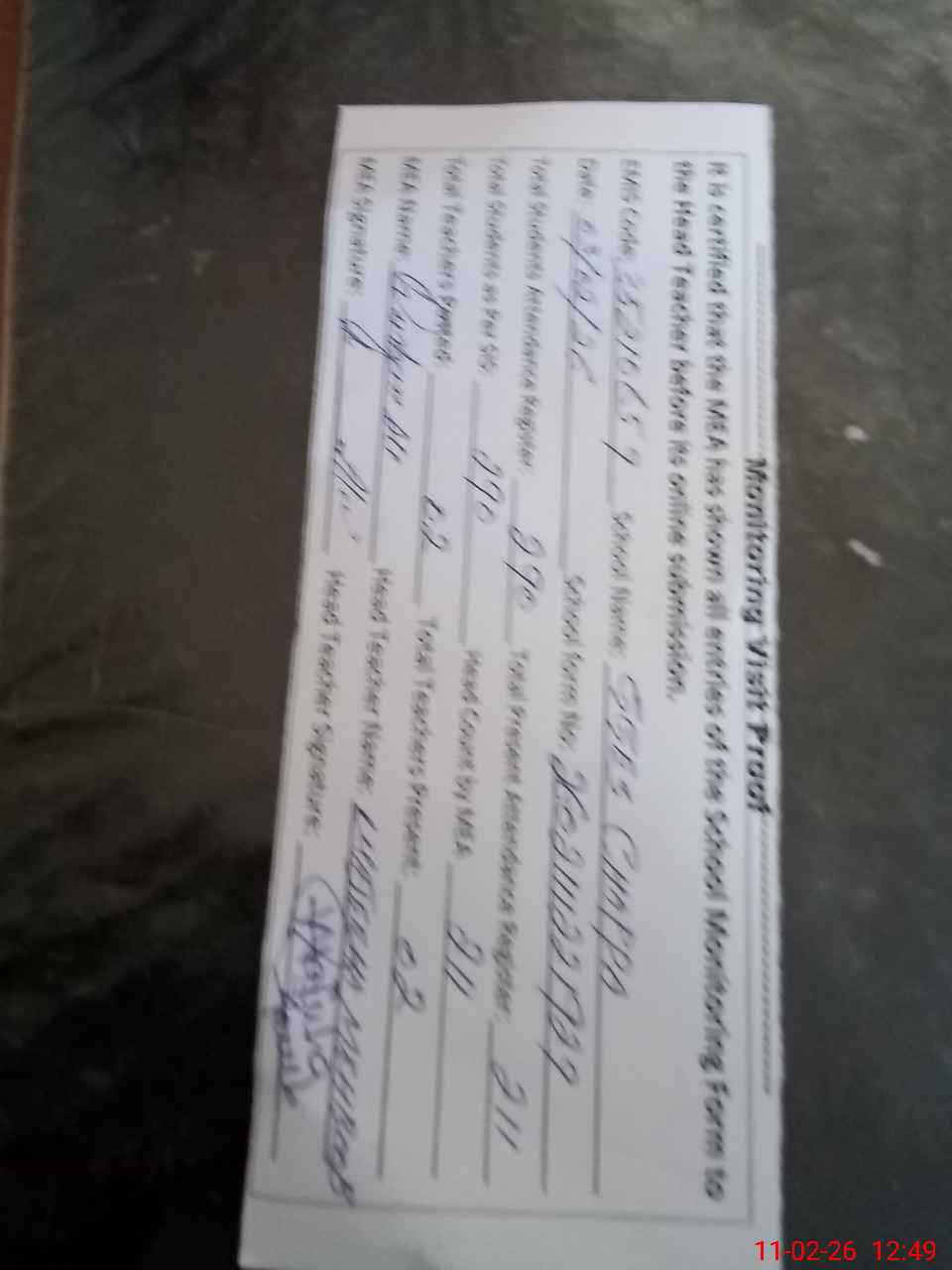 | Remarks (Use Separate Page if Required): Latest Administrator visit of the Dy DEO on 26th November 2025 and 21st October 2025. Latest Administrator visit of the AEO on 23rd September 2025 wash basins 04 non functional in the school due to Water taps broken/not available. FTF not maintained properly NSB fund register in the month of January 2026 maintained but with led pencil. | |||||
