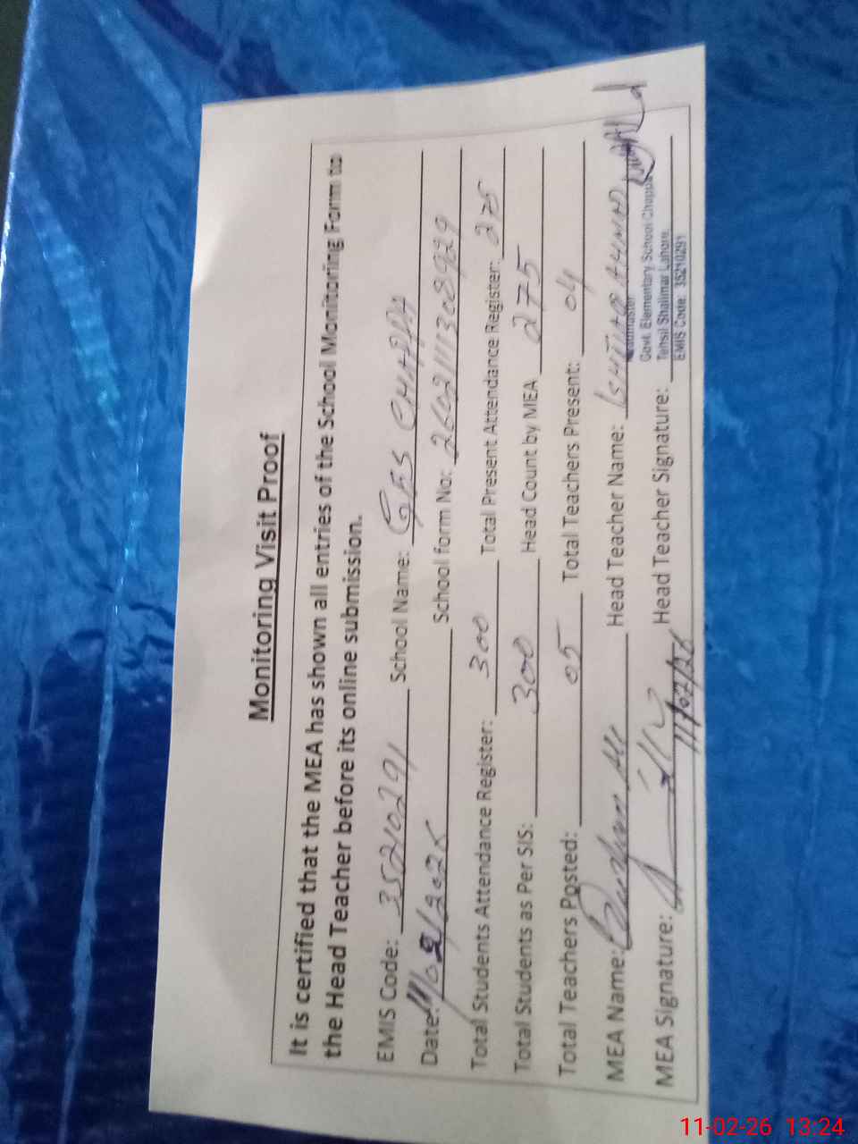 | Attendance Register | Head Teacher | MEA with School | Visit Proof |