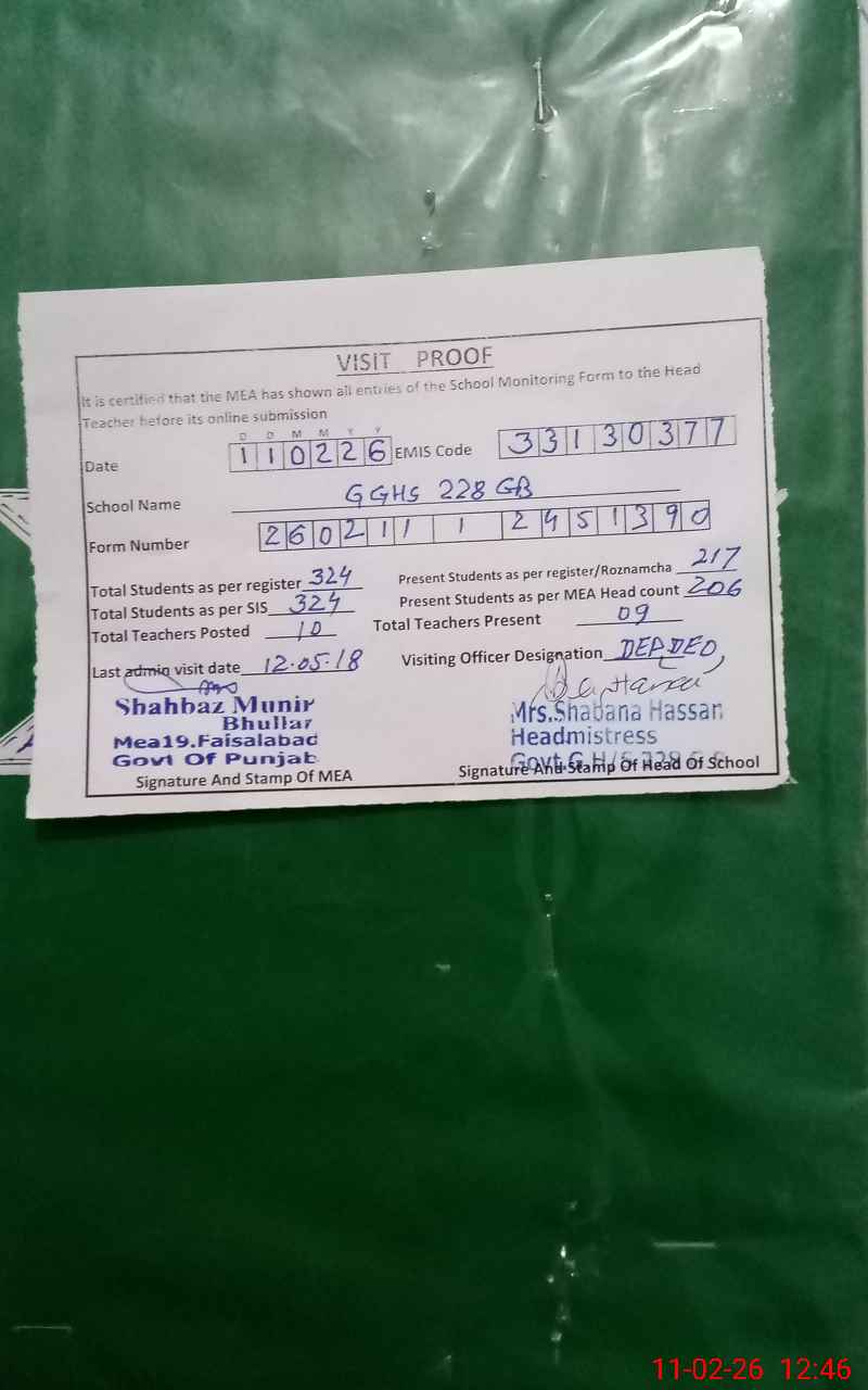 | EMIS Code: 33130377 | Name of School: GGHS CHAK NO 228 GB | |||