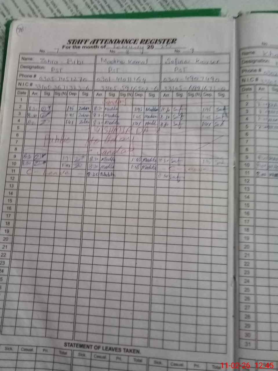 | CNIC | Full Name | Designation | R/C | Absence During Last Calender Month |