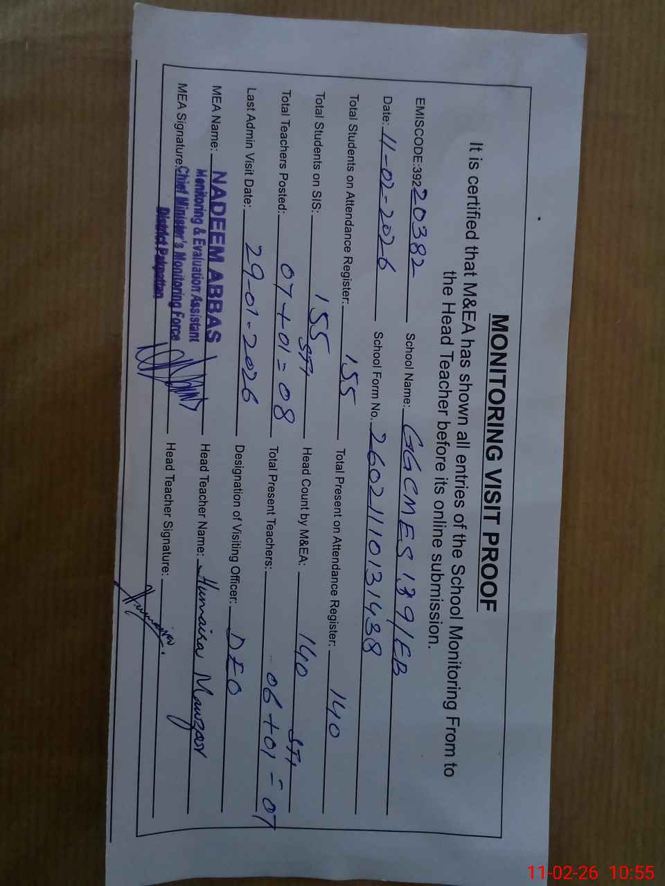 | Certified that this School was Inspected by the Undersigned MEA/DMO Today and the Information Stated Above is as Per Record. | |||||