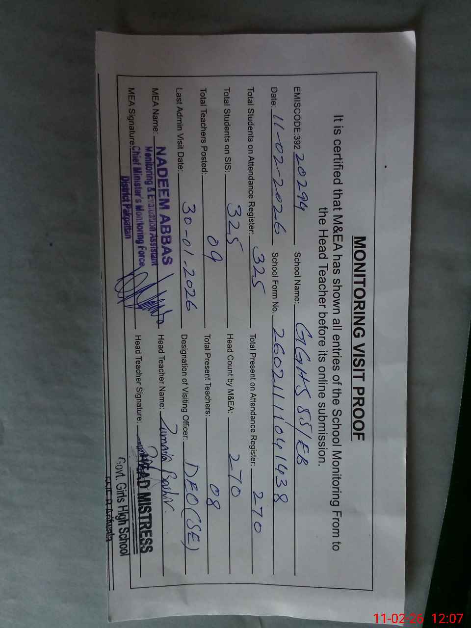 | Certified that this School was Inspected by the Undersigned MEA/DMO Today and the Information Stated Above is as Per Record. | |||||
