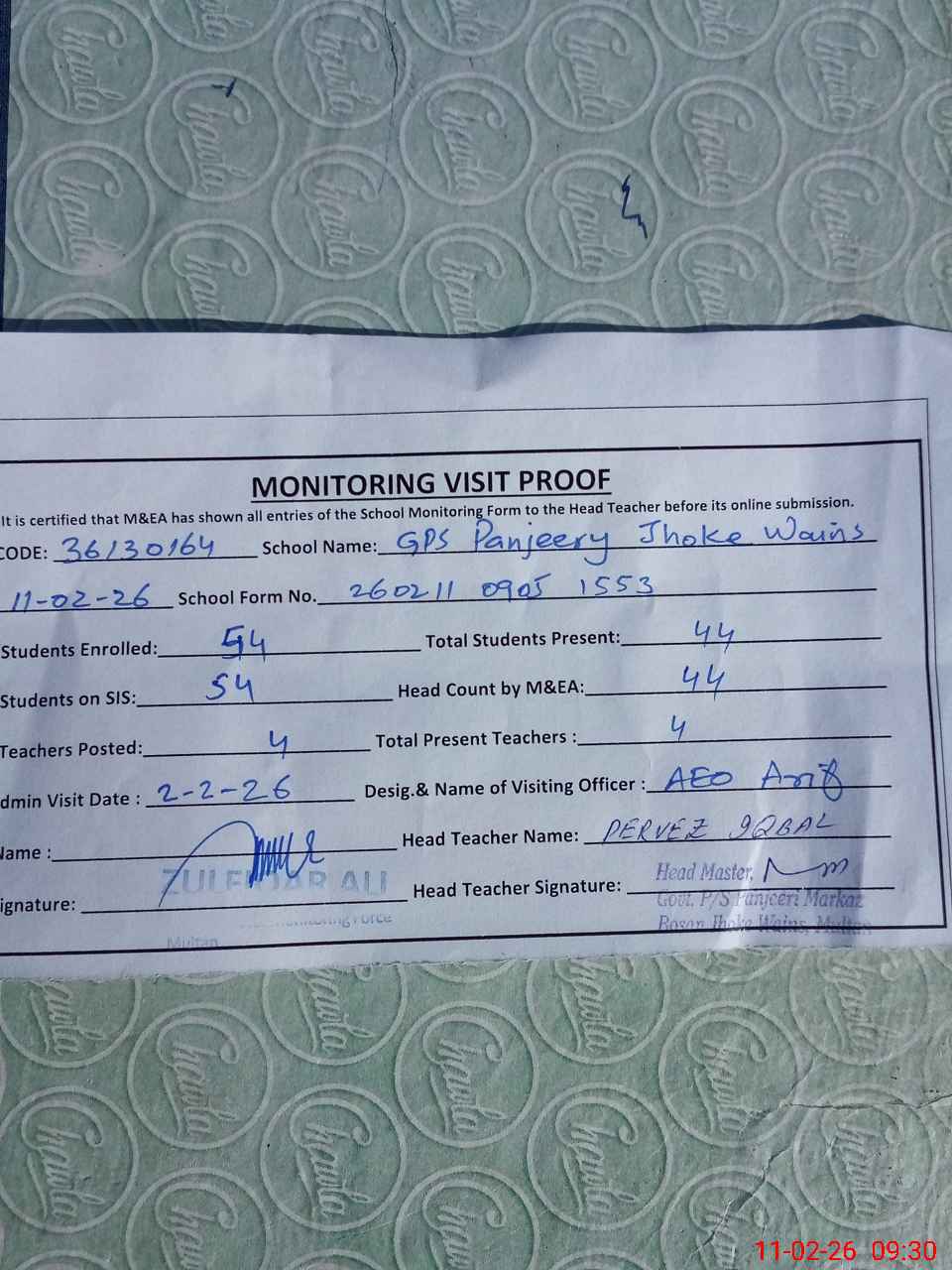 | Monitoring Date: 11-02-2026 | Start Time: 11-02-2026 09:04 AM | End Time: 11-02-2026 09:32 AM | Name of MEA: Zu**** Al**** | |