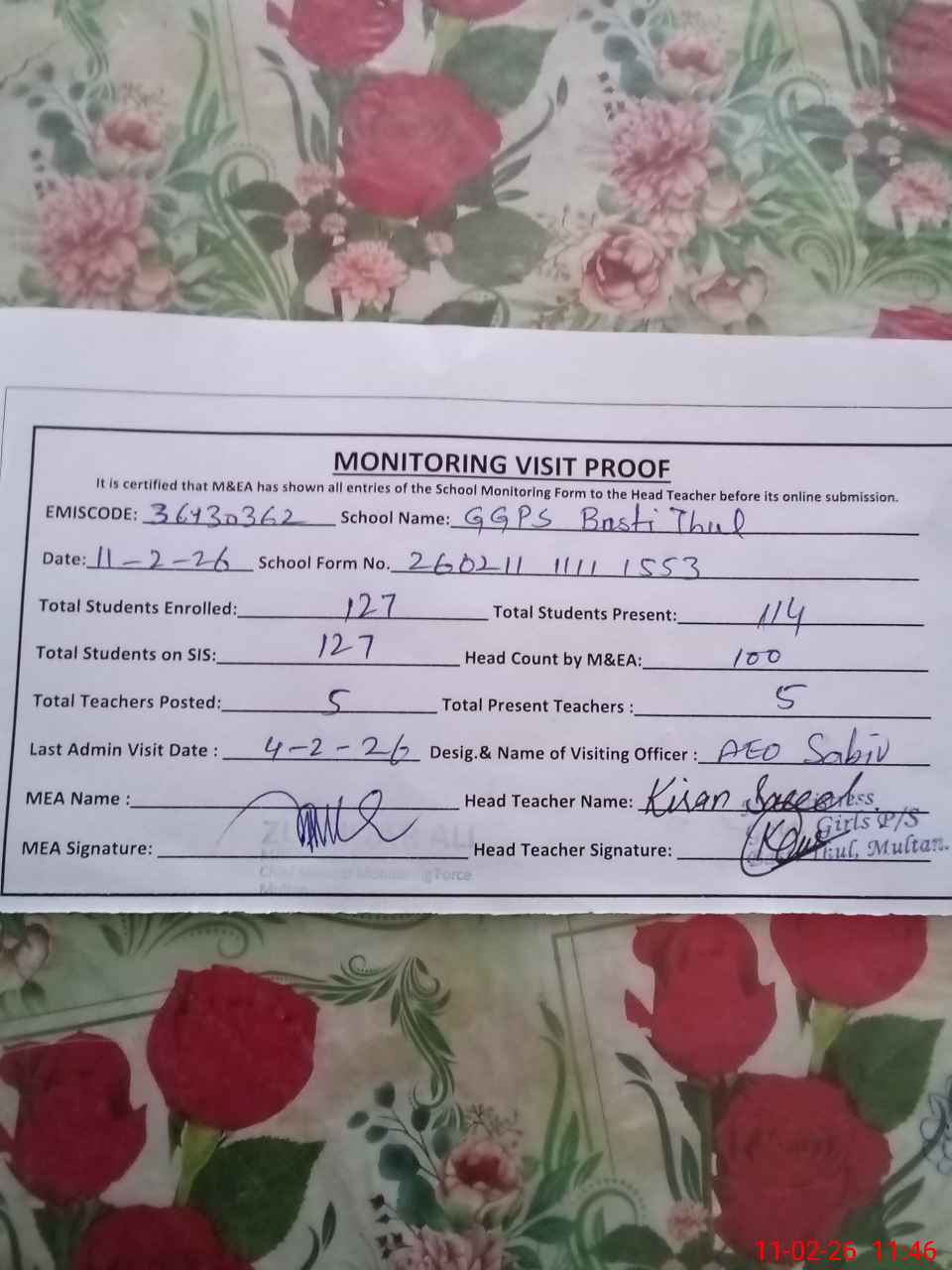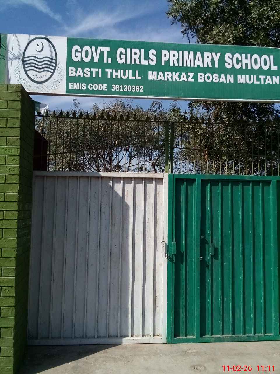 | EMIS Code: 36130362 | Name of School: GGPS BASTI THUL P/O JHOKE VAINCE MULTAN | |||