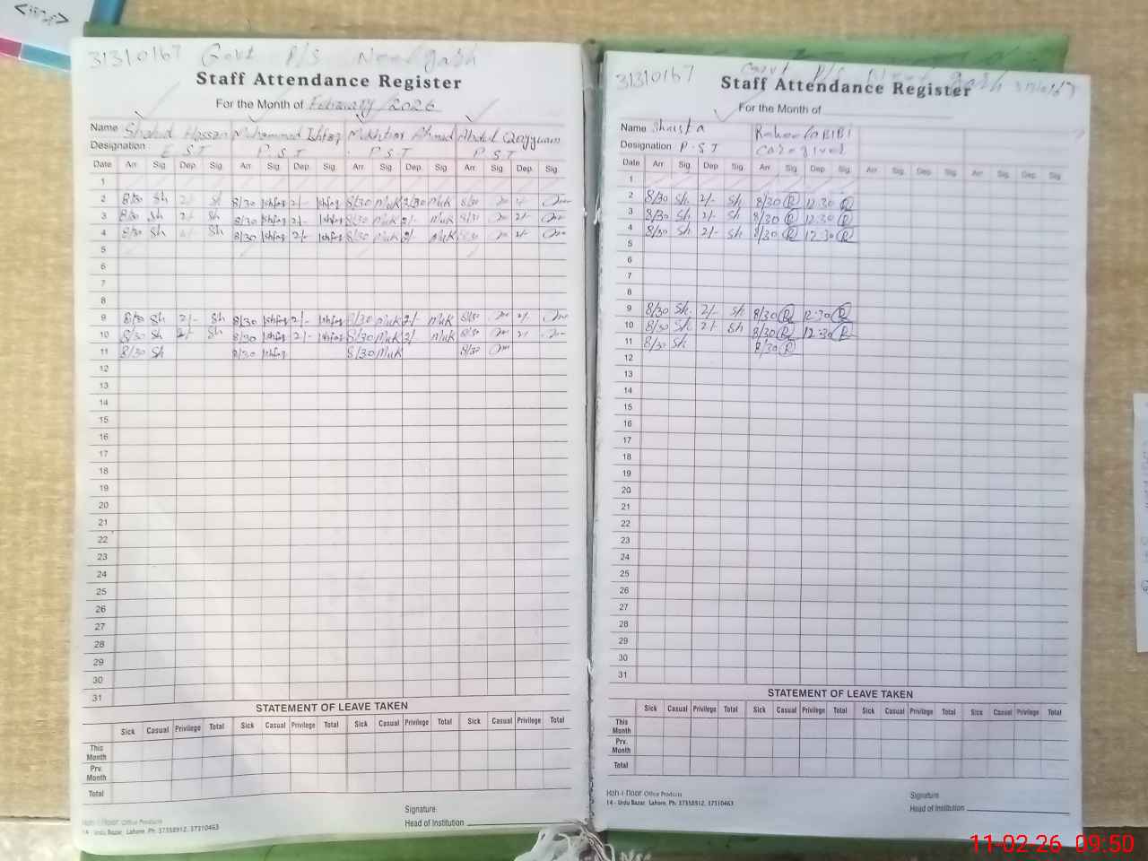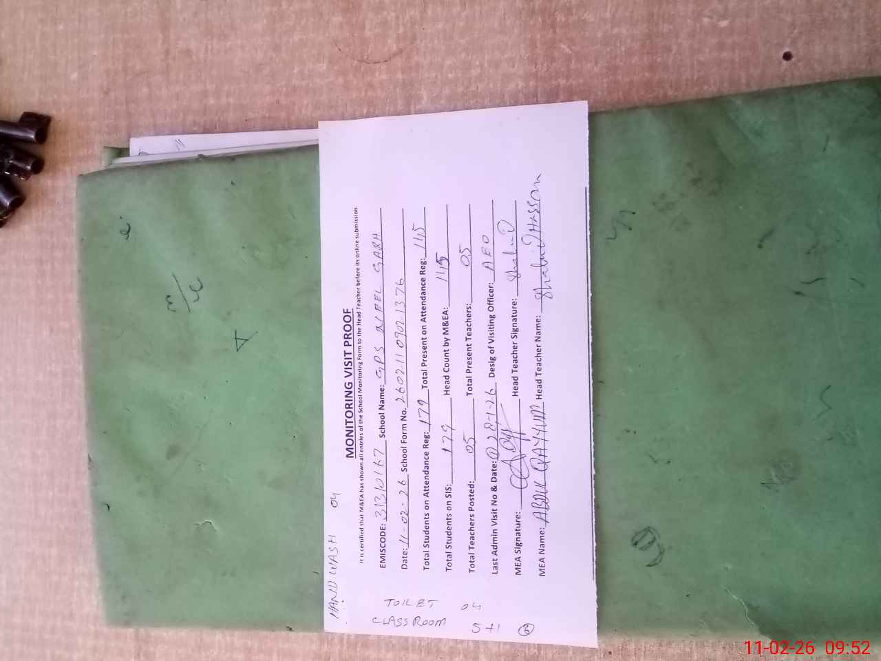 | Attendance Register | Head Teacher | MEA with School | Visit Proof |