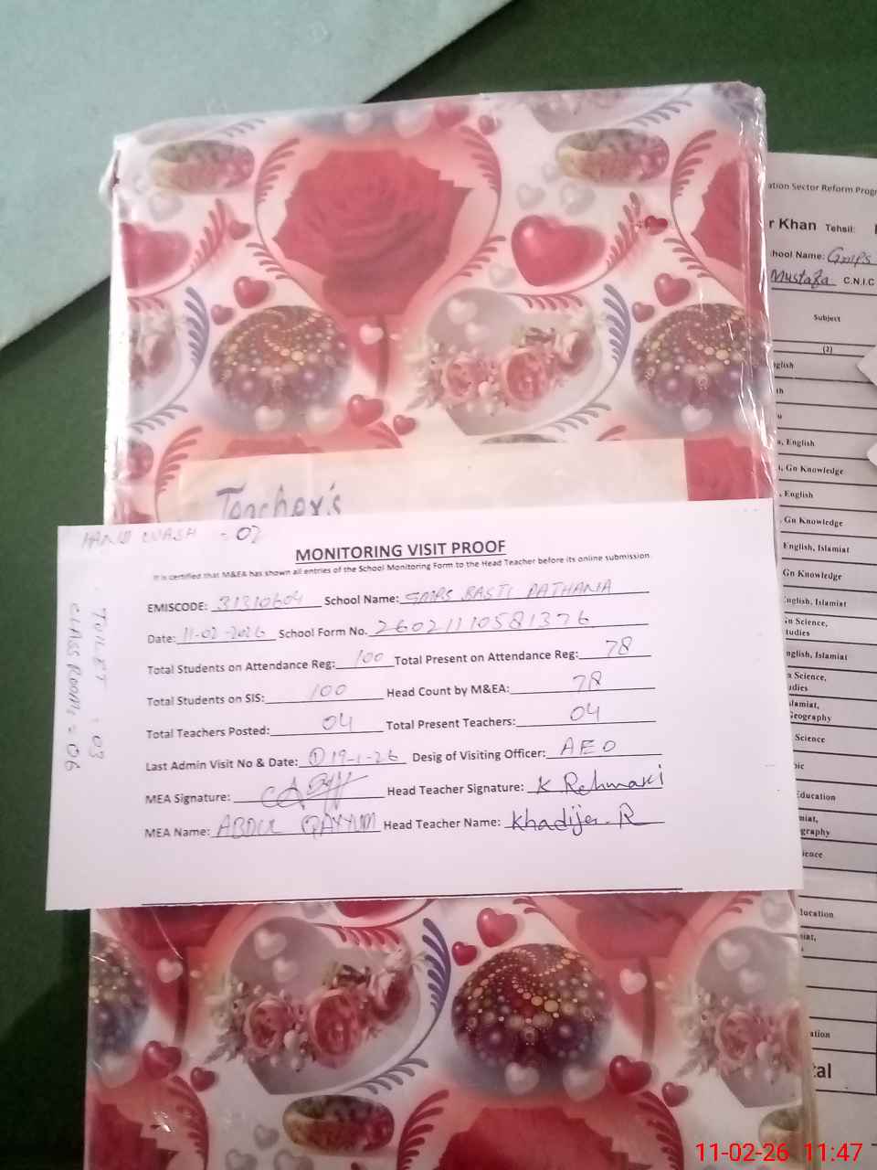 | Attendance Register | Head Teacher | MEA with School | Visit Proof |