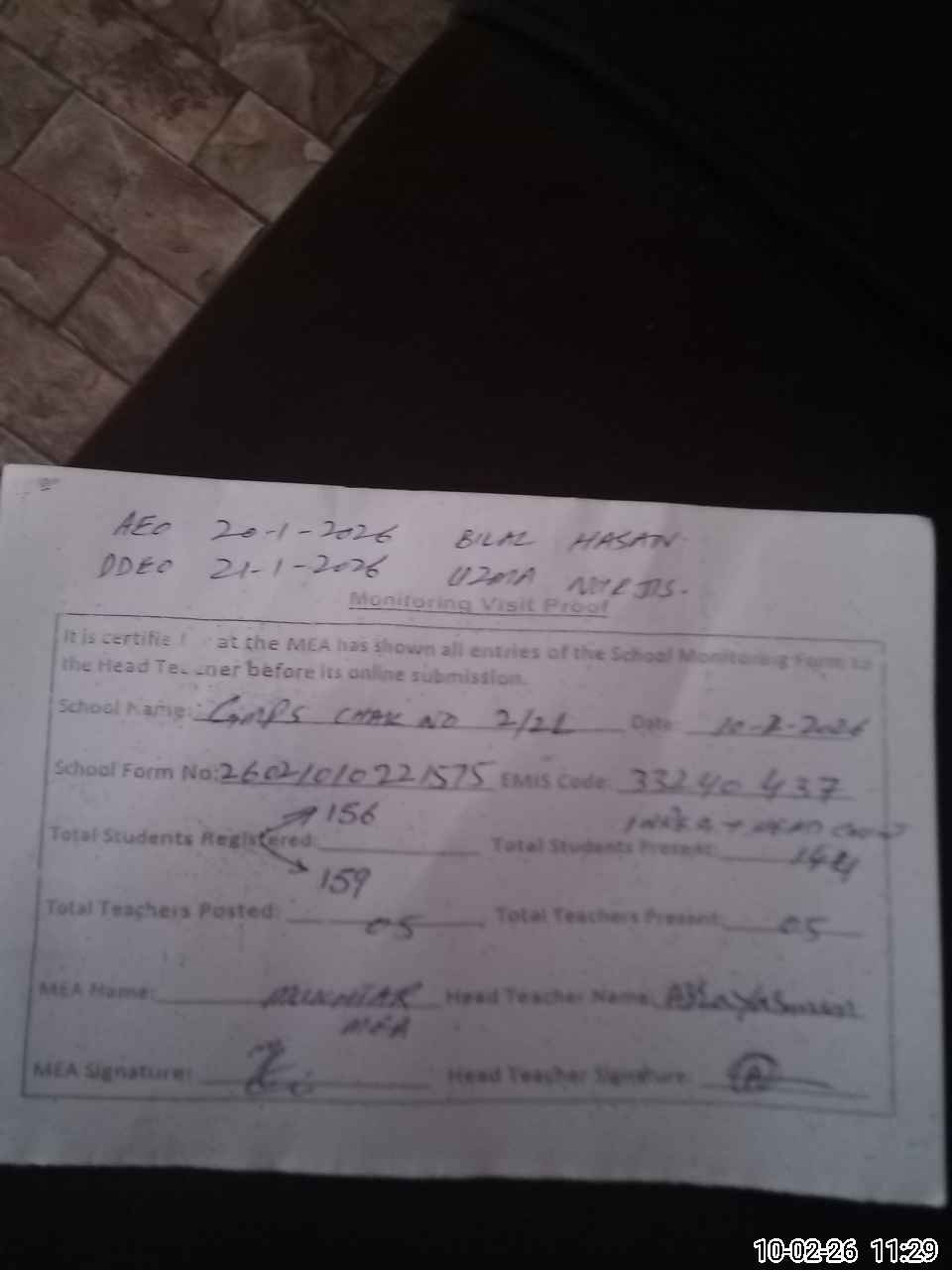 | Attendance Register | Head Teacher | MEA with School | Visit Proof |