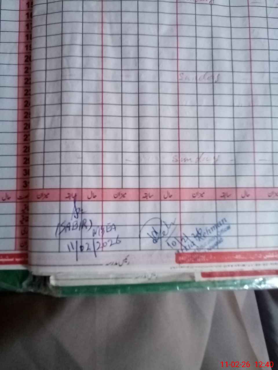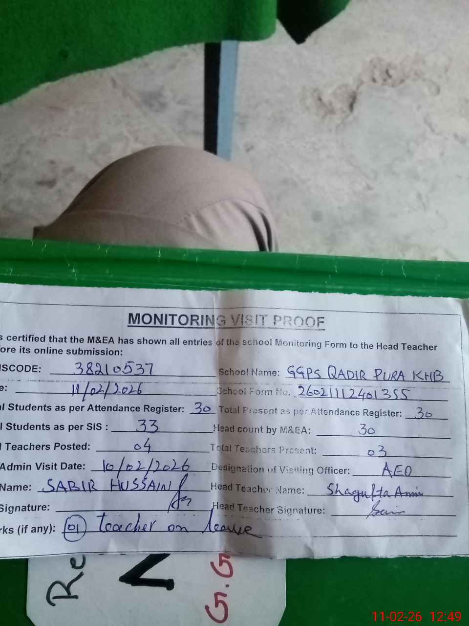 | Remarks (Use Separate Page if Required): no teacher absent total students on register 33 total students on SiS 33 last admin visit by AEO on 10 Feb 2026 | |||||