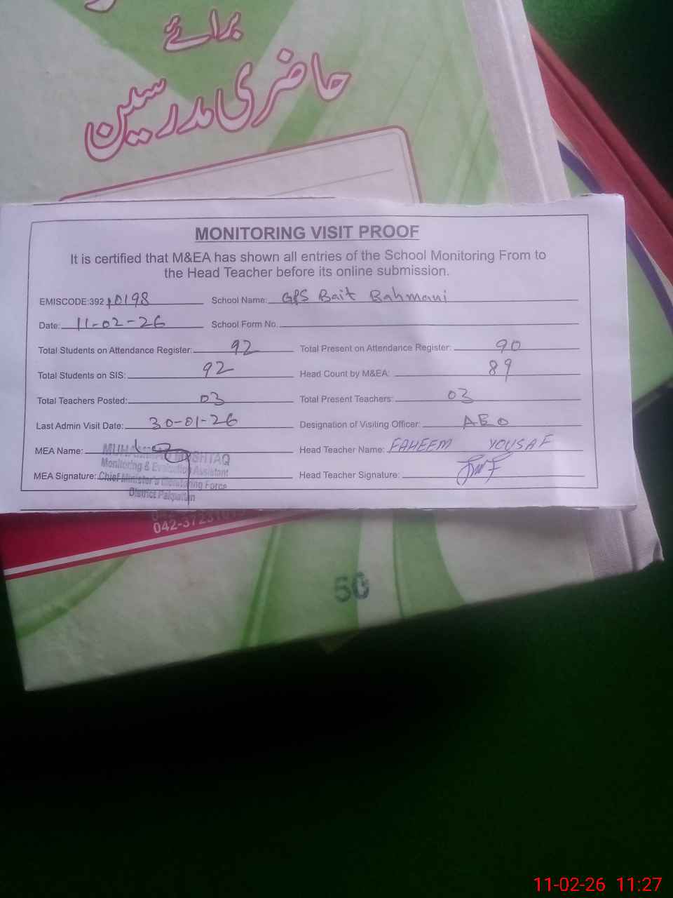| Attendance Register | Head Teacher | MEA with School | Visit Proof |