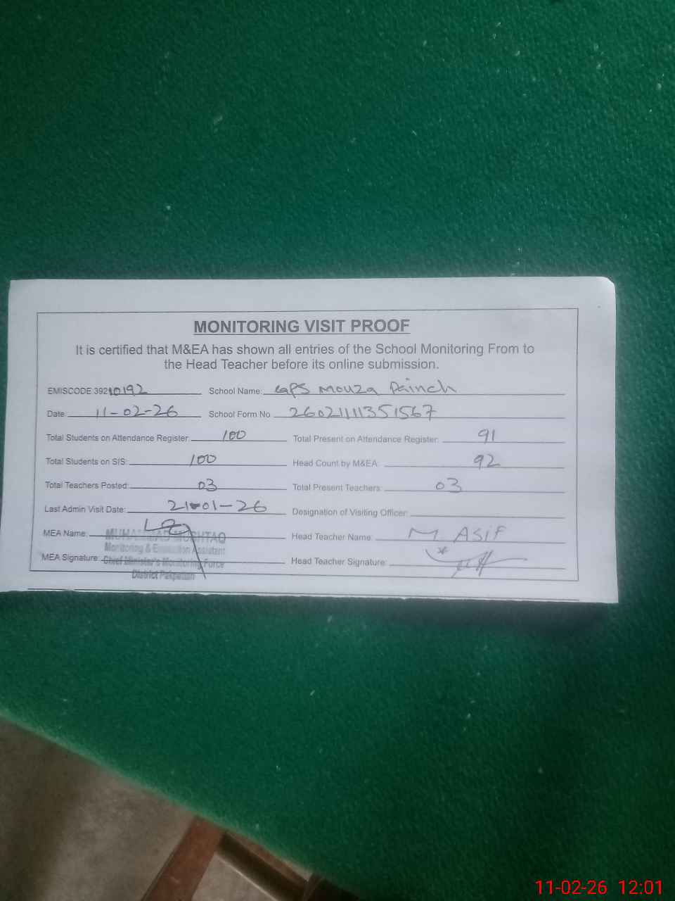 | Attendance Register | Head Teacher | MEA with School | Visit Proof |