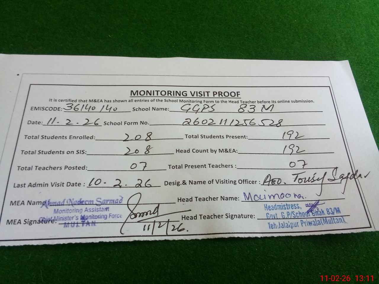 | EMIS Code: 36140140 | Name of School: GGPS CHAK NO. 83/M | |||