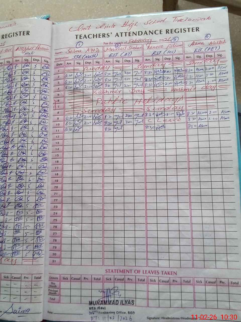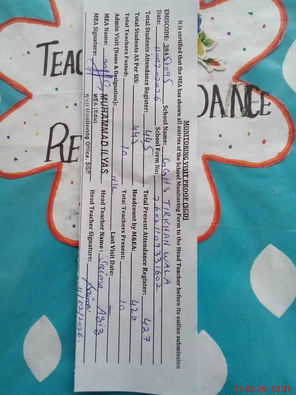 | Attendance Register | Head Teacher | MEA with School | Visit Proof |